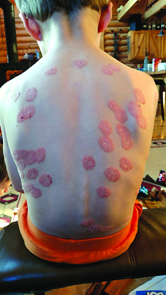 Il quadro clinico è quasi mai grave perché, a differenza che negli adulti, la psoriasi a chiazze nei bambini, è più sfumato, con lesioni meno squamose, di piccole dimensioni e di spessore ridotto. Ad andamento clinico altrettanto favorevole è la già descritta psoriasi guttata che ammonta a circa il 40% dei casi, si autorisolve in pochi mesi ma in alcuni bambini, può talvolta evolvere in psoriasi a chiazze. Molti testi descrivono la psoriasi come non pruriginosa, ma in una elevata percentuale di casi pediatrici, specie se nelle pieghe o se l’eritema è intenso e diffuso, le lesioni psoriasiche sono invece molto pruriginose e il grattamento può favorire diverse superinfezioni batteriche. è perciò molto importante che i medici ricordino che le placche nella psoriasi pediatrica possono prudere, e che se c’è prurito la psoriasi non va esclusa a priori. Altre sedi cutanee più esposte al rischio di presentare le lesioni psoriasiche desquamative nei bambini sono: la regione retro-auricolare, ombelicale, e la regione del volto. Quando è colpito il viso a essere più interessate sono la regione palpebrale e peri-palpebrale, con chiazze ben delimitate, tendenti alla cronicizzazione, da differenziare dalla dermatite atopica. Si può anche trovare una cheilite desquamativa sia in corso di una forma diffusa che localizzata. Non infrequente è anche il coinvolgimento della lingua. In circa un sesto dei bambini malati si riscontra pure la forma palmo-plantare, che più frequentemente si manifesta nella forma a chiazze che nella variante pustolosa, o con un quadro intermedio tra psoriasi ed eczema. La psoriasi in età pediatria, oltre che la cute, può coinvolgere le unghie e, purtroppo, come nell’adulto, la forma ungueale (30%) si associa, a un più elevato rischio di sviluppare artrite psoriasica. La malattia è tendenzialmente cronica, a evoluzione recidivante. La remissione delle lesioni cutanee dura un periodo variabile, ma è possibile, soprattutto nei bambini, che i sintomi non si ripresentino più per tutta la vita. Ci sono altresì casi di psoriasi infantile che iniziano con una malattia lieve che nel tempo progredisce fino a diventare moderata/grave. Riguardo alla terapia non ci sono specifiche linee guida che tengano in conto le differenze con la patologia degli adulti. Ciò rafforza le preoccupazioni per chi si deve occupare di questa popolazione di pazienti. L’American Academy of Dermatology e la National Psoriasis Foundation, hanno congiuntamente provato ad approfondire questa tematica, partendo dall’analisi degli impatti fisici e psicosociali ed emotivi indotti dalla malattia su bambini e adolescenti colpiti. Per contro, queste raccomandazioni includono diversi agenti biologici che hanno ricevuto l’approvazione della FDA americana per questa indicazione, ma che non ancora approvati in Italia per uso pediatrico. Nella stessa condizione si trovano le cure suggerite per contrastare le comorbidità e garantire la sicurezza del trattamento a lungo termine. La mancanza di opzioni terapeutiche approvate per questa fascia d’età è dovuta alla ridotta quantità di studi finalizzati alla valutazione dell’accettabilità e all’approvazione di farmaci attivi, soprattutto di tipo biologico, considerato che bambini e adolescenti si trovano ancora in una fase di immaturità e sviluppo immunologici. Sarebbero necessarie quindi anche ricerche ad hoc, per stabilire se in questi pazienti l’impatto delle terapie, biologiche e non, diminuisce nel tempo. In sintesi, le cure attualmente possibili in età pediatrica sono quasi esclusivamente di tipo locale. A seconda dei protocolli si usano creme a base di cortisonici, il calcipotriolo che, come è noto, è un derivato della vitamina D, il tazarotene, il catrame vegetale, anti-infiammatori non steroidei.